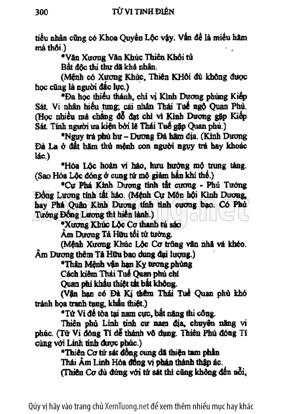 Tử vi tinh điển diễn dịch cho người đọc và chỉ rõ rằng cổ nghĩa ghi ở các bài phú của cổ nhân, ẩn chứa nhiều ngụ ý sâu xa về các cung cách ngũ hành, số phận, tính cách của mỗi con người. Ngoài ra, sách còn có những tìm tòi phát hiện về những sao có ghi trong sách vở bên Trung Quốc như Âm sát, Quan sát, Tuế dịch, Phan án, Tức thần, Thiên sát, Chi bối, Nguyệt sát, Vọng thần...