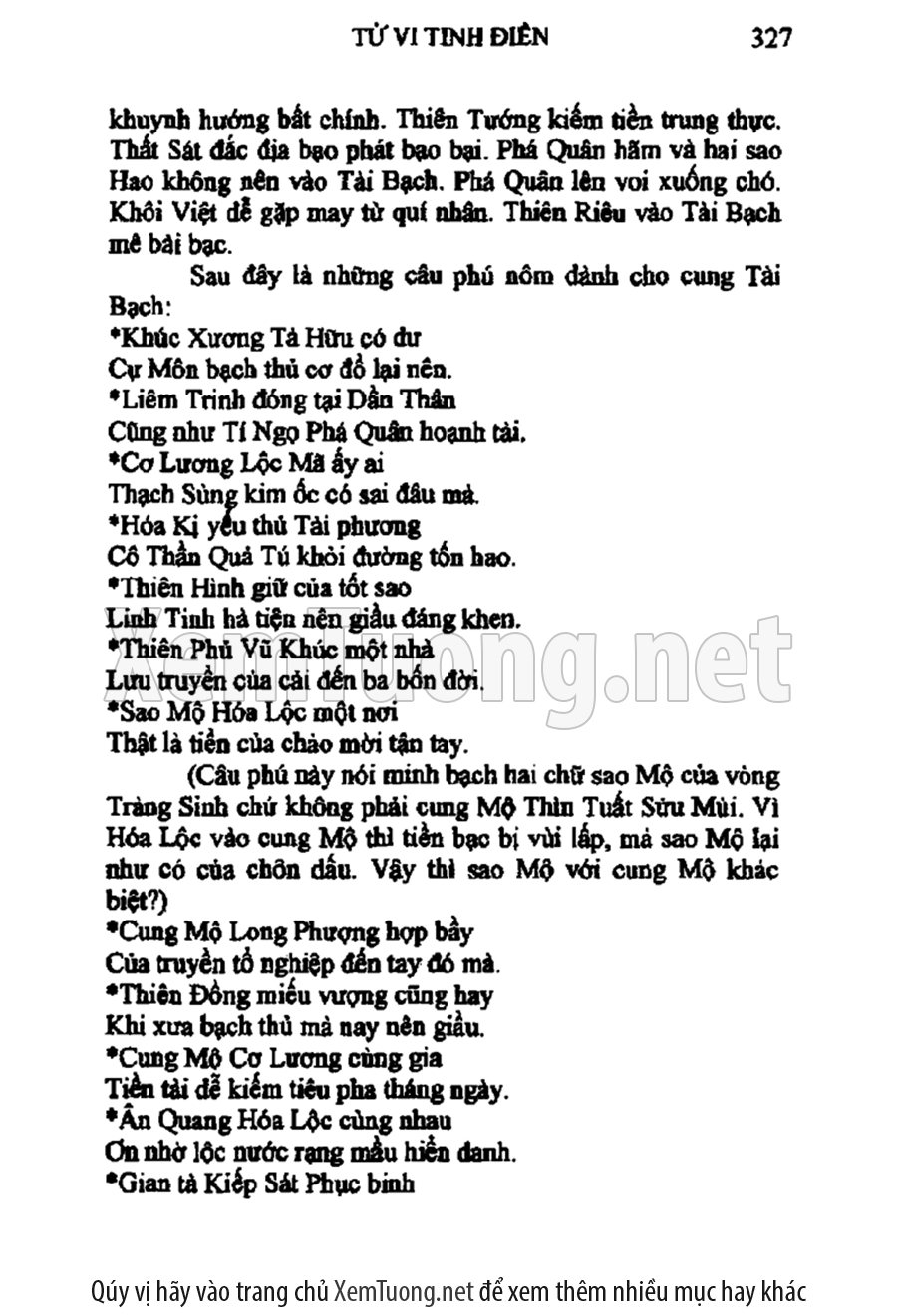 Tử vi tinh điển diễn dịch cho người đọc và chỉ rõ rằng cổ nghĩa ghi ở các bài phú của cổ nhân, ẩn chứa nhiều ngụ ý sâu xa về các cung cách ngũ hành, số phận, tính cách của mỗi con người. Ngoài ra, sách còn có những tìm tòi phát hiện về những sao có ghi trong sách vở bên Trung Quốc như Âm sát, Quan sát, Tuế dịch, Phan án, Tức thần, Thiên sát, Chi bối, Nguyệt sát, Vọng thần...