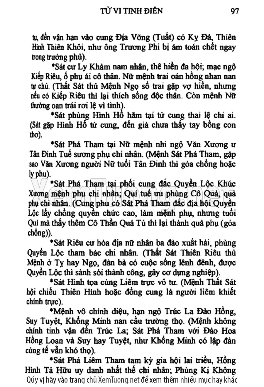 Tử vi tinh điển diễn dịch cho người đọc và chỉ rõ rằng cổ nghĩa ghi ở các bài phú của cổ nhân, ẩn chứa nhiều ngụ ý sâu xa về các cung cách ngũ hành, số phận, tính cách của mỗi con người. Ngoài ra, sách còn có những tìm tòi phát hiện về những sao có ghi trong sách vở bên Trung Quốc như Âm sát, Quan sát, Tuế dịch, Phan án, Tức thần, Thiên sát, Chi bối, Nguyệt sát, Vọng thần...