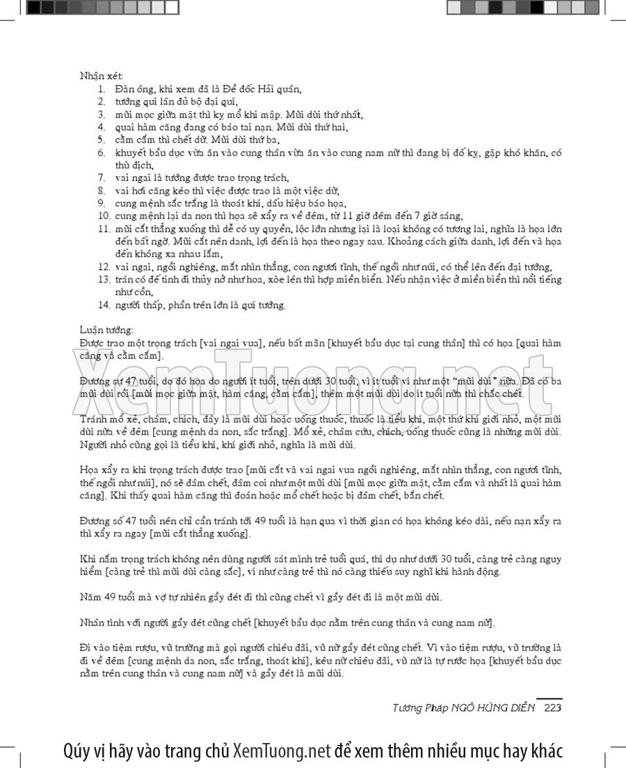 Ưu điểm của tướng pháp Ngô Hùng Diễn là các tướng pháp luật. Tinh thông những tướng pháp luật này, người nghiên cứu nhân tướng có thể luận giải nhiều đề tài trong “cõi nhân sinh” một cách rất “thần tình”. Vì vậy mà đã có người gọi Cụ Ngô Hùng Diễn là thày “Ma-xó”, có người xưng tụng Cụ là “Thần”, là “Thánh”, hay rõ ràng hơn, đặt cho Cụ danh hiệu “Thiên Linh Sư”. Danh xưng nào, nếu quá đáng, Cụ đều xin tha, đừng gọi như vậy.