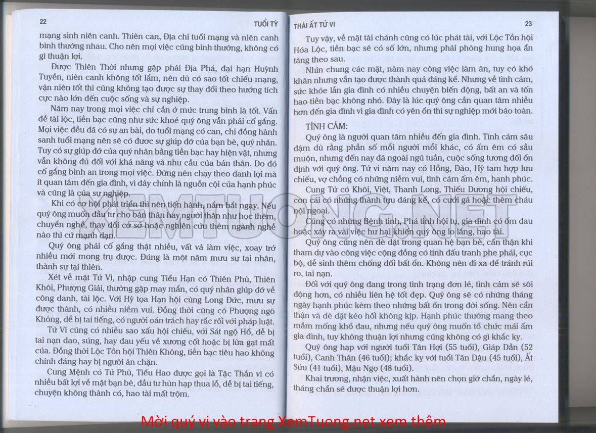 (Lưu ý: Thái Ất Tử Vi được chúng tôi scan từ sách, do đó mỗi tuổi sẽ có nhiều trang, quý vị xem xong hãy nhấn vào trang tiếp theo để xem hết phần tuổi muốn xem. Nếu quý vị xem bằng điện thoại thì hãy kéo qua lại để xem phần bị khuất.)