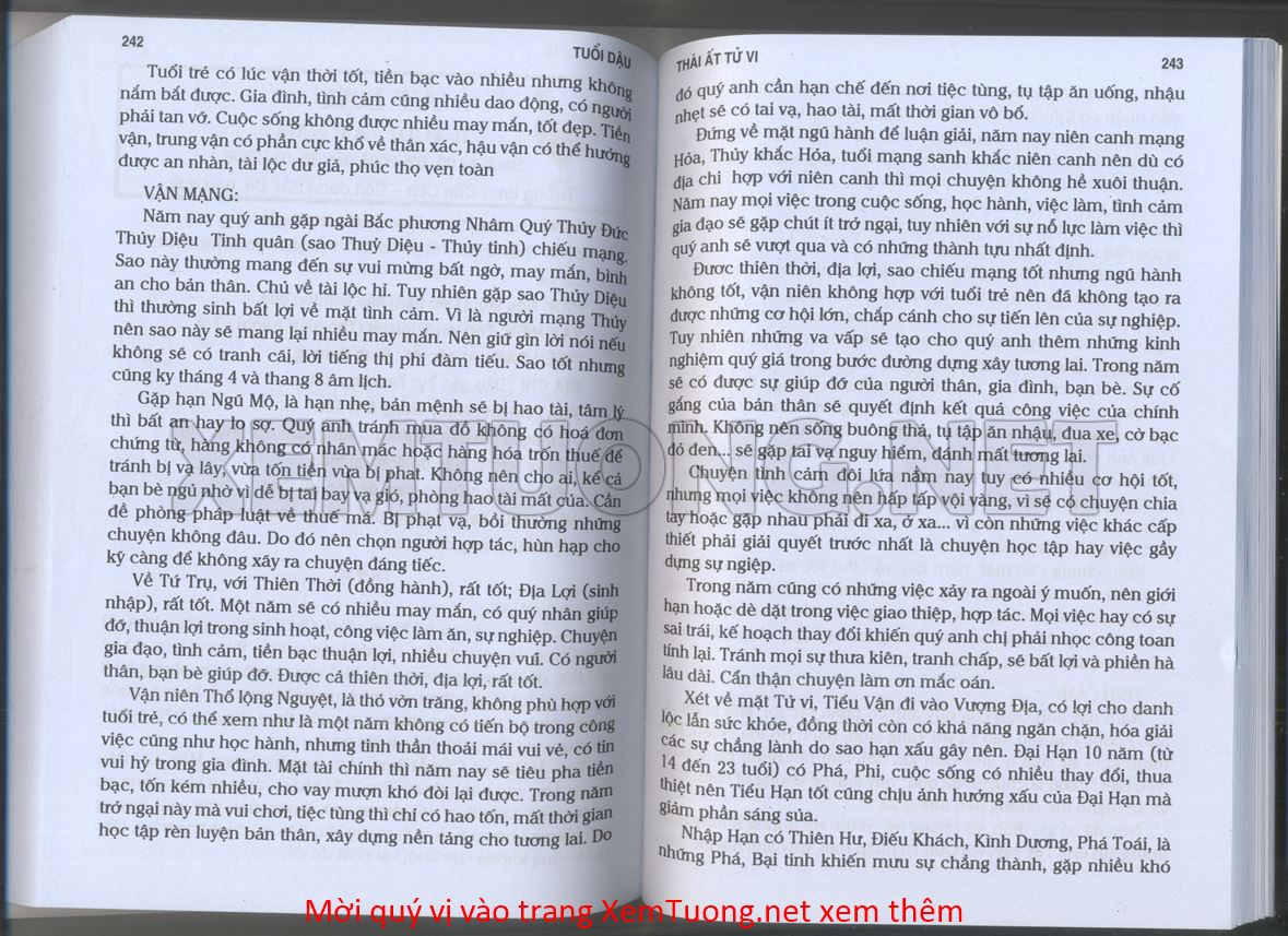 (Lưu ý: Thái Ất Tử Vi được chúng tôi scan từ sách, do đó mỗi tuổi sẽ có nhiều trang, quý vị xem xong hãy nhấn vào trang tiếp theo để xem hết phần tuổi muốn xem. Nếu quý vị xem bằng điện thoại thì hãy kéo qua lại để xem phần bị khuất.)