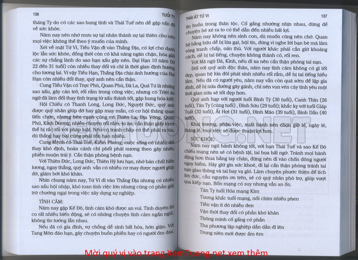 (Lưu ý: Thái Ất Tử Vi được chúng tôi scan từ sách, do đó mỗi tuổi sẽ có nhiều trang, quý vị xem xong hãy nhấn vào trang tiếp theo để xem hết phần tuổi muốn xem. Nếu quý vị xem bằng điện thoại thì hãy kéo qua lại để xem phần bị khuất.)