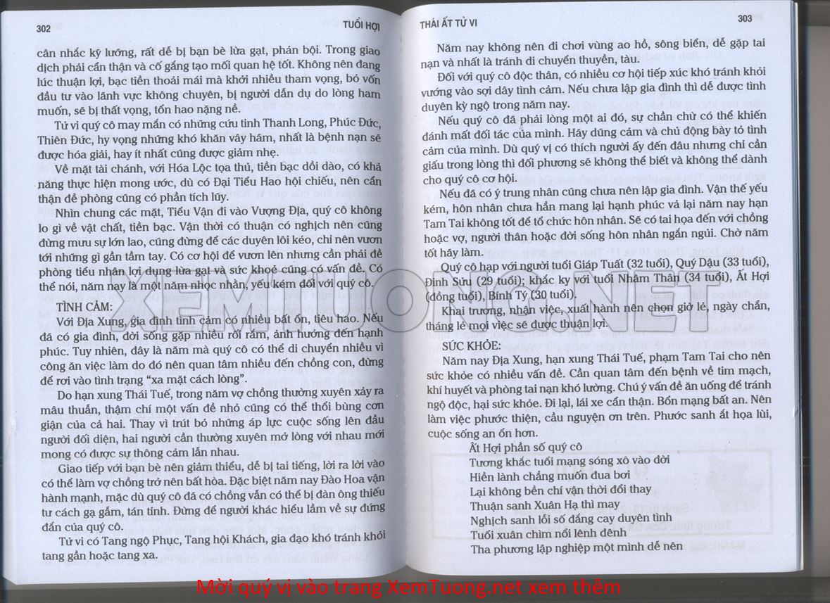 (Lưu ý: Thái Ất Tử Vi được chúng tôi scan từ sách, do đó mỗi tuổi sẽ có nhiều trang, quý vị xem xong hãy nhấn vào trang tiếp theo để xem hết phần tuổi muốn xem. Nếu quý vị xem bằng điện thoại thì hãy kéo qua lại để xem phần bị khuất.)