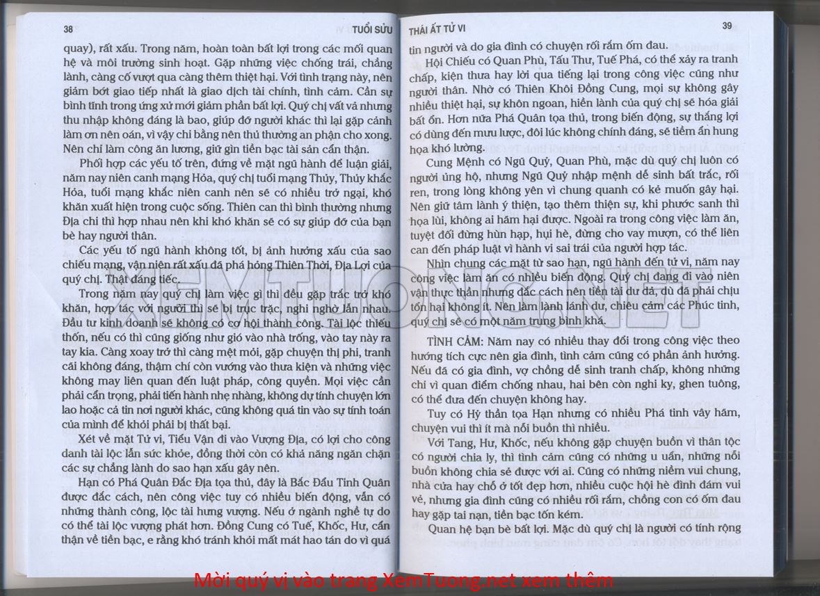 (Lưu ý: Thái Ất Tử Vi được chúng tôi scan từ sách, do đó mỗi tuổi sẽ có nhiều trang, quý vị xem xong hãy nhấn vào trang tiếp theo để xem hết phần tuổi muốn xem. Nếu quý vị xem bằng điện thoại thì hãy kéo qua lại để xem phần bị khuất.)