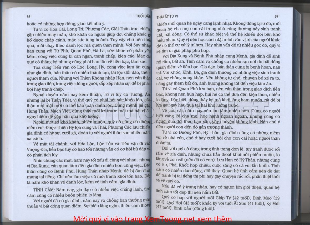 (Lưu ý: Thái Ất Tử Vi được chúng tôi scan từ sách, do đó mỗi tuổi sẽ có nhiều trang, quý vị xem xong hãy nhấn vào trang tiếp theo để xem hết phần tuổi muốn xem. Nếu quý vị xem bằng điện thoại thì hãy kéo qua lại để xem phần bị khuất.)