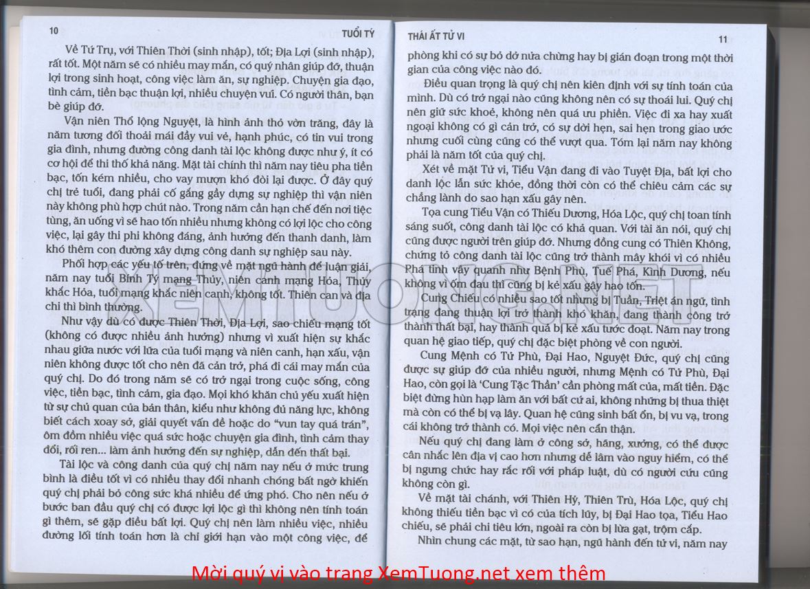 (Lưu ý: Thái Ất Tử Vi được chúng tôi scan từ sách, do đó mỗi tuổi sẽ có nhiều trang, quý vị xem xong hãy nhấn vào trang tiếp theo để xem hết phần tuổi muốn xem. Nếu quý vị xem bằng điện thoại thì hãy kéo qua lại để xem phần bị khuất.)