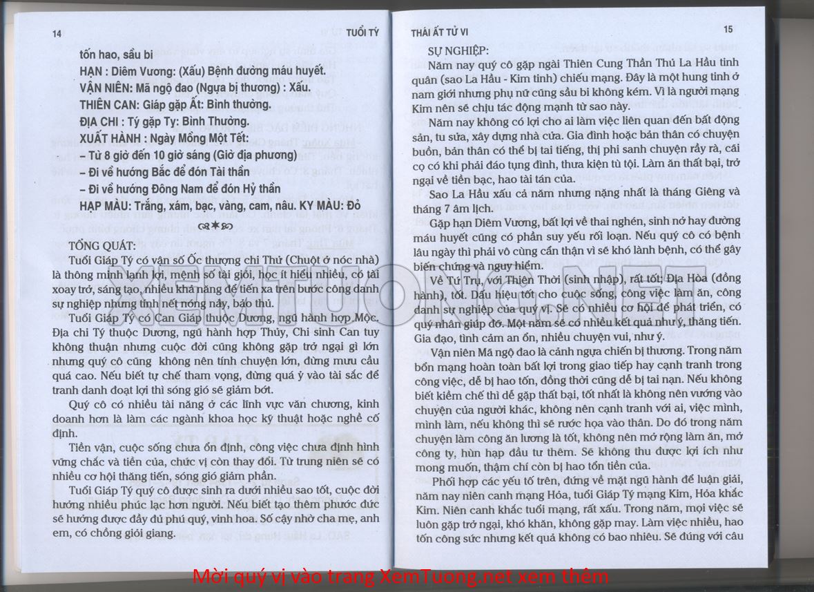 (Lưu ý: Thái Ất Tử Vi được chúng tôi scan từ sách, do đó mỗi tuổi sẽ có nhiều trang, quý vị xem xong hãy nhấn vào trang tiếp theo để xem hết phần tuổi muốn xem. Nếu quý vị xem bằng điện thoại thì hãy kéo qua lại để xem phần bị khuất.)