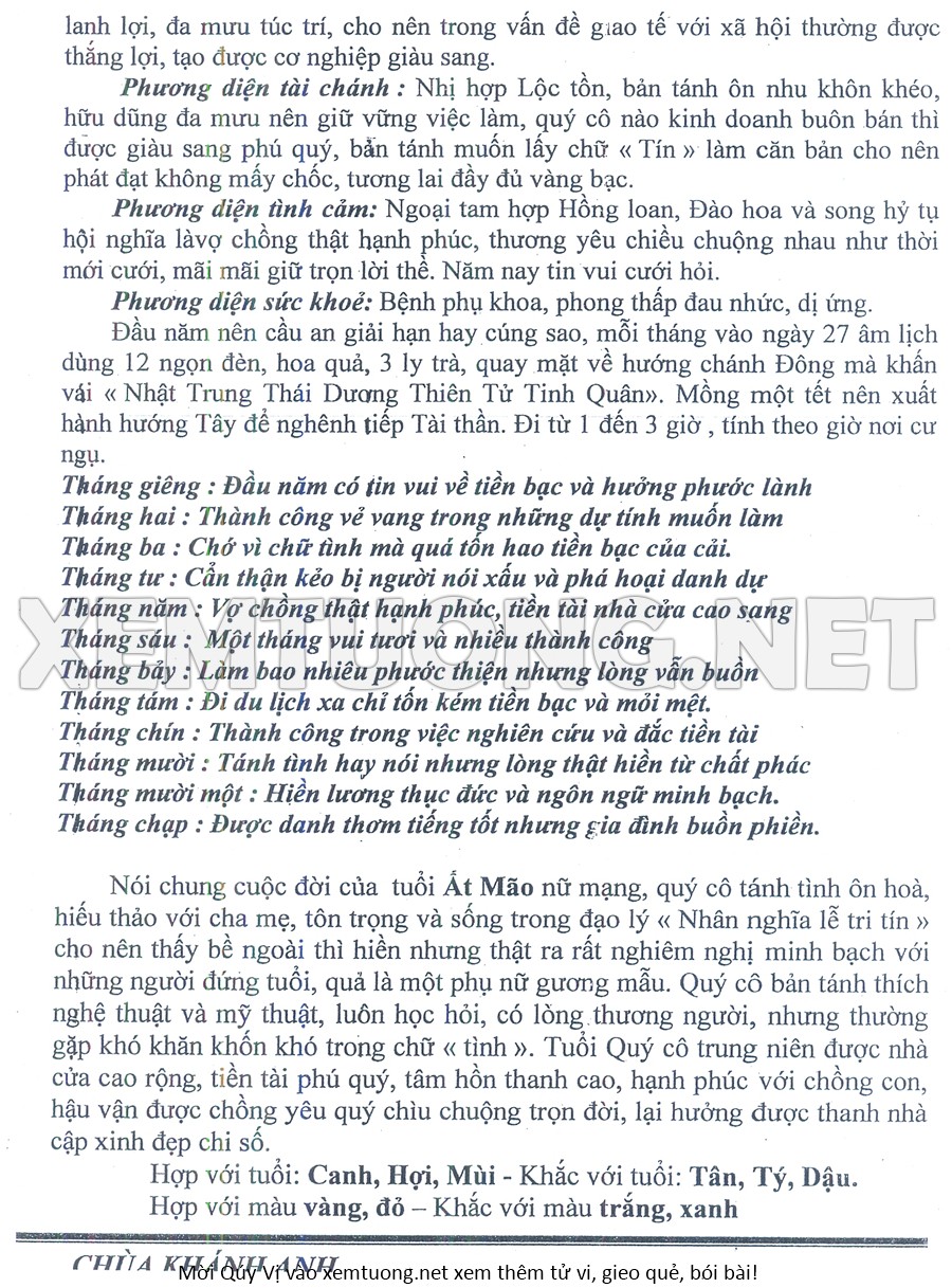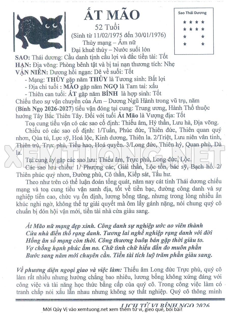 Tử Vi Năm Bính Ngọ 2026 mạng nữ ẤT MÃO