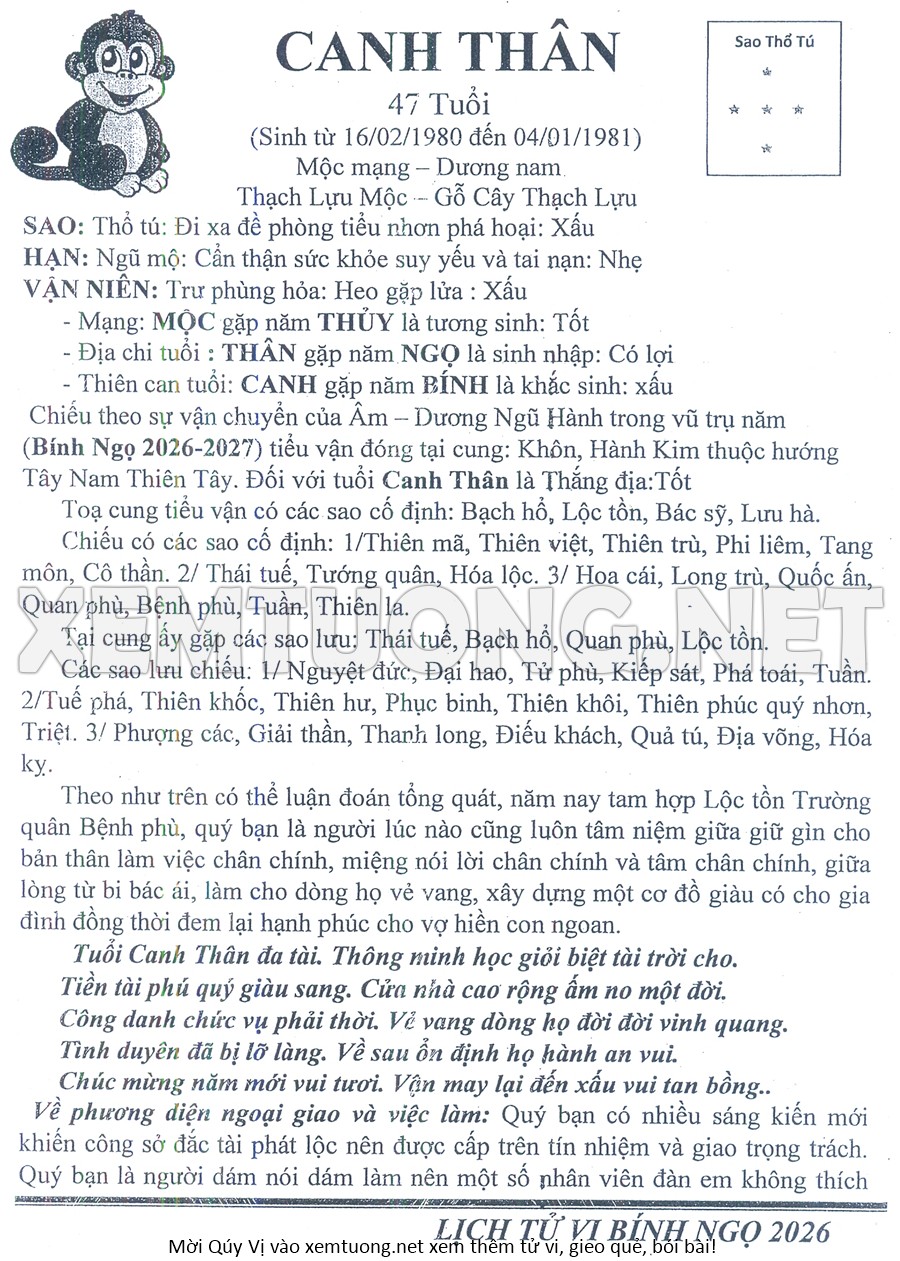 Tử Vi Năm Bính Ngọ 2026 mạng nam CANH THÂN