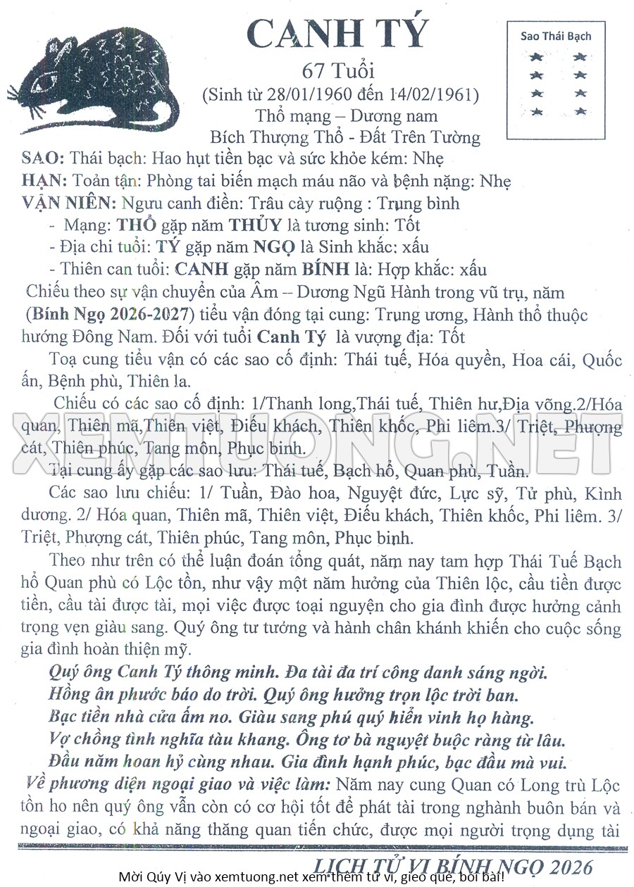 Tử Vi Năm Bính Ngọ 2026 mạng nam CANH TÝ
