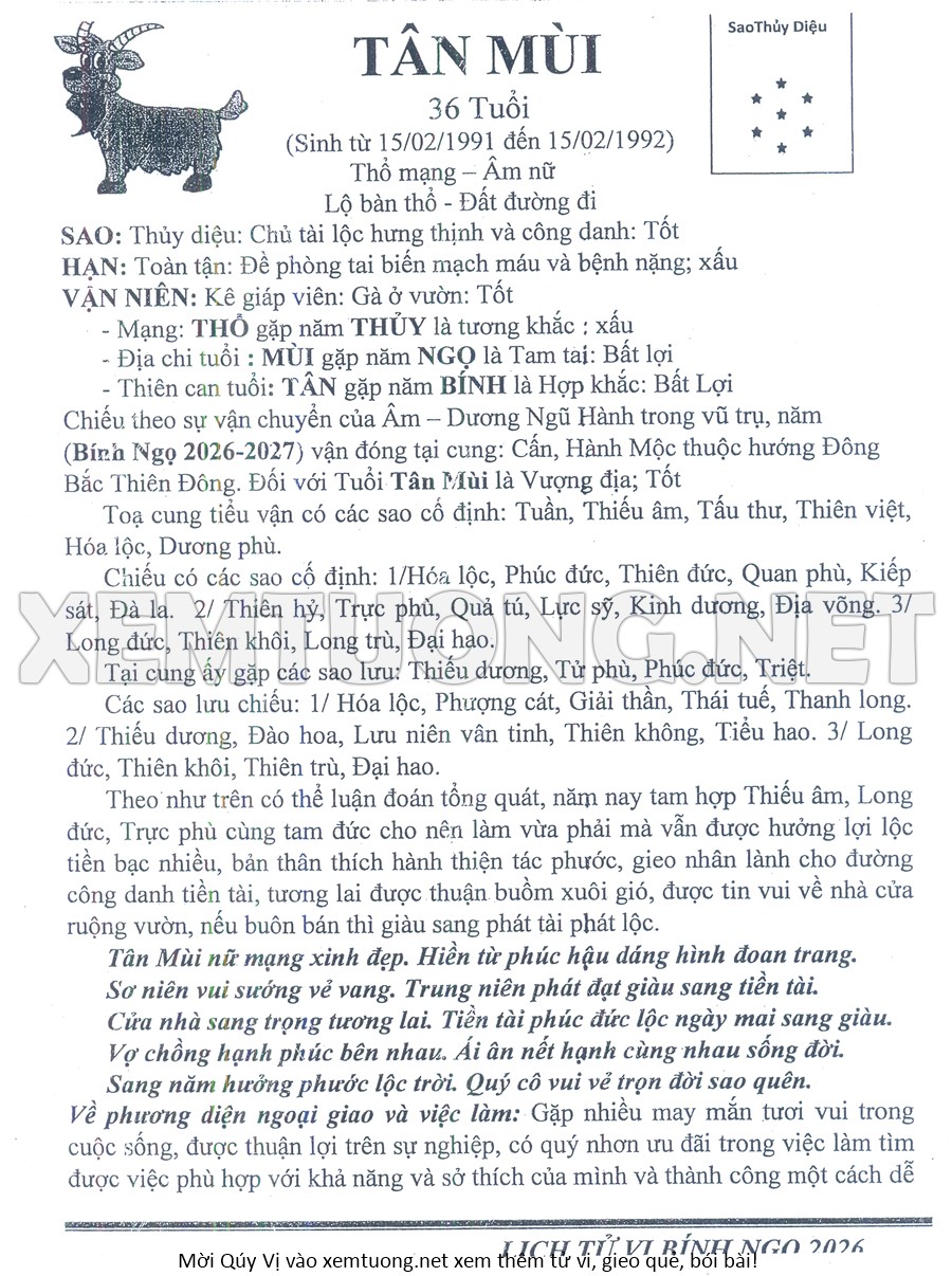Tử Vi Năm Bính Ngọ 2026 mạng nữ TÂN MÙI