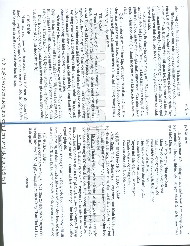 (Lưu ý: Thái Ất Tử Vi được chúng tôi scan từ sách, do đó mỗi tuổi sẽ có nhiều trang, quý vị xem xong hãy nhấn vào trang tiếp theo để xem hết phần tuổi muốn xem. Nếu quý vị xem bằng điện thoại thì hãy kéo qua lại để xem phần bị khuất.)