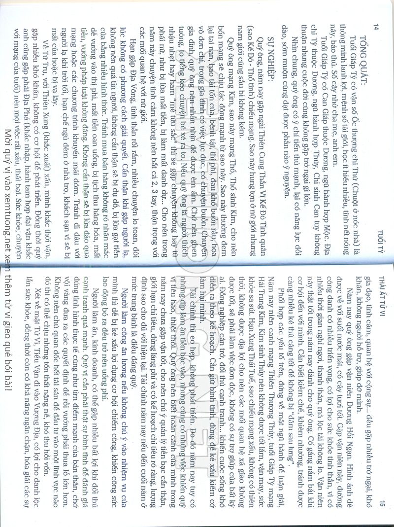 (Lưu ý: Thái Ất Tử Vi được chúng tôi scan từ sách, do đó mỗi tuổi sẽ có nhiều trang, quý vị xem xong hãy nhấn vào trang tiếp theo để xem hết phần tuổi muốn xem. Nếu quý vị xem bằng điện thoại thì hãy kéo qua lại để xem phần bị khuất.)
