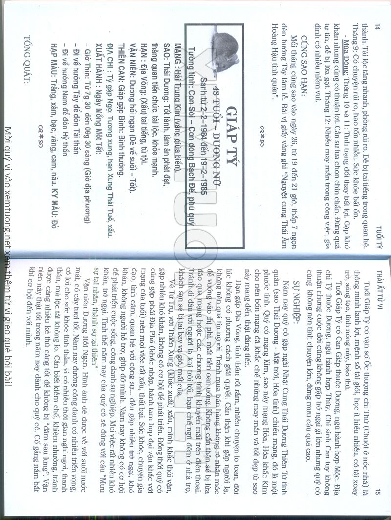 (Lưu ý: Thái Ất Tử Vi được chúng tôi scan từ sách, do đó mỗi tuổi sẽ có nhiều trang, quý vị xem xong hãy nhấn vào trang tiếp theo để xem hết phần tuổi muốn xem. Nếu quý vị xem bằng điện thoại thì hãy kéo qua lại để xem phần bị khuất.)